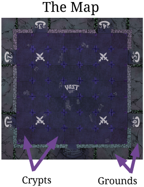 Grounds: A rectangular space around the outside of the map, bounded by hedges, adjacent to multiple crypts.